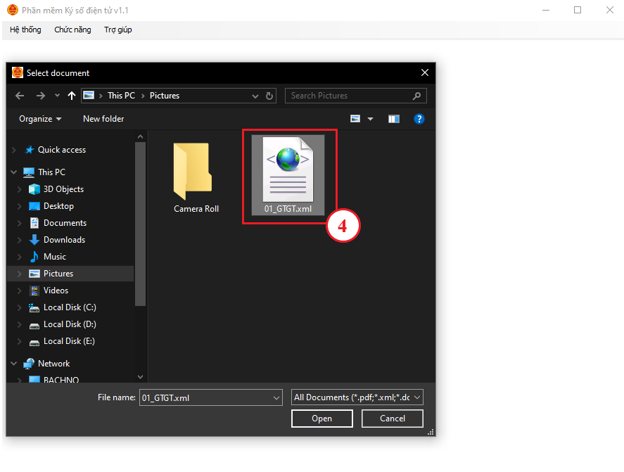 Bước 1.4: Trên giao diện phần mềm ký số điện tử SigningHub, chọn Hệ Thống → Mở tệp (3), sau đó chọn file XML (4) tờ khai đã kết xuất từ HTKK.
