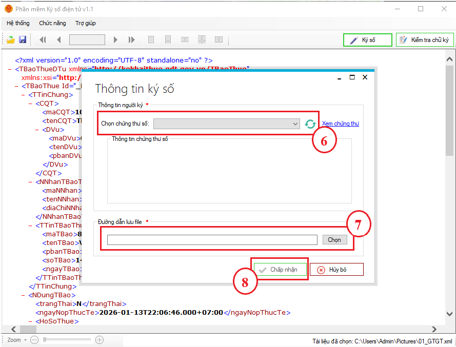 Bước 1.6: Chọn đúng Chứng thư số (6), thiết lập Đường dẫn lưu file (7), sau đó click Chấp nhận (8) và nhập User Pin để thực hiện ký số.