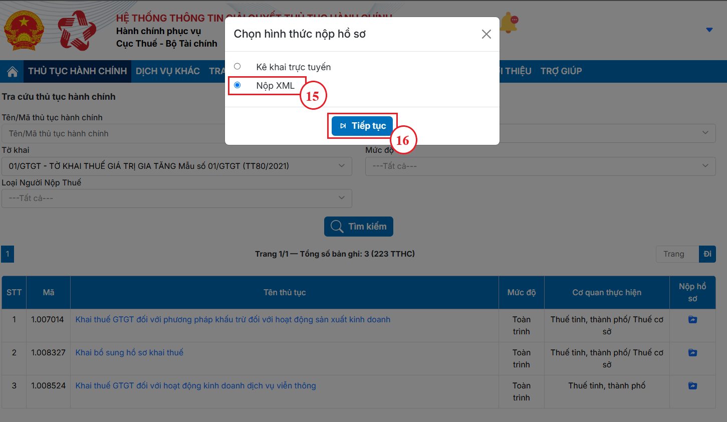Bước 1.9: Hệ thống hiện Popup Chọn hình thức nộp hồ sơ bạn chọn hình thức Nộp XML (15) bấm Tiếp tục (16) để chọn tờ khai XML.