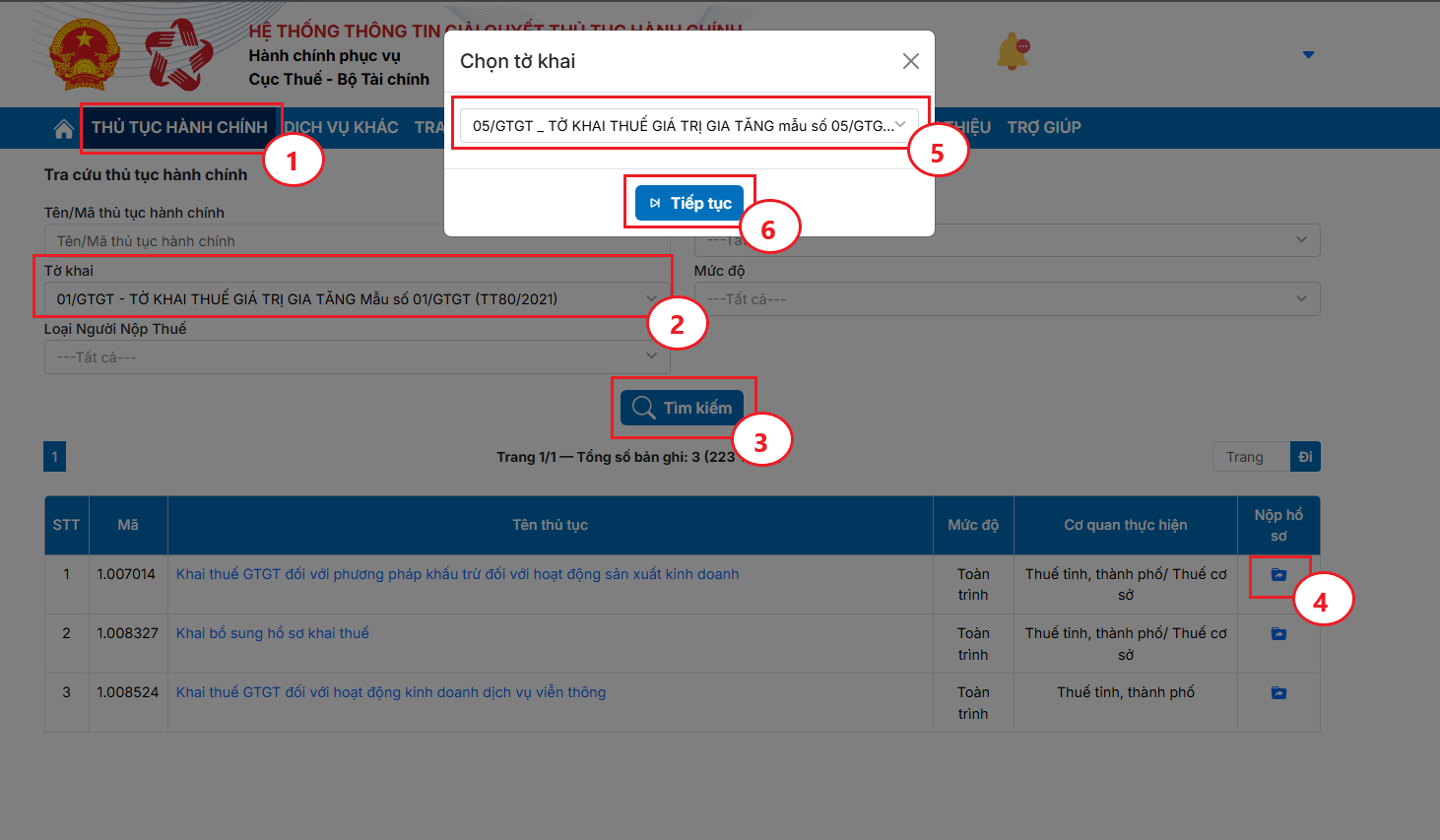 Bước 2.4: Trên thanh menu, Bạn vào Thủ tục hành chính (1), chọn mục Tờ khai (2), thực hiện Tìm kiếm (3) tờ khai cần nộp; tại danh sách kết quả, bấm Nộp hồ sơ (4), tích chọn đúng loại tờ khai (5) và nhấn Tiếp tục (6) để chuyển sang bước tiếp theo.