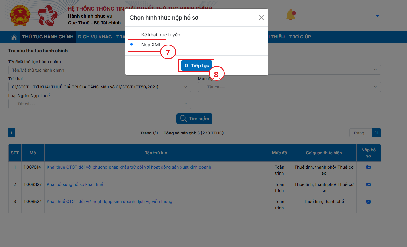 Bước 2.5: Hệ thống hiện Popup Chọn hình thức nộp hồ sơ bạn chọn hình thức Nộp XML (7) bấm Tiếp tục (8) để chọn tờ khai XML.