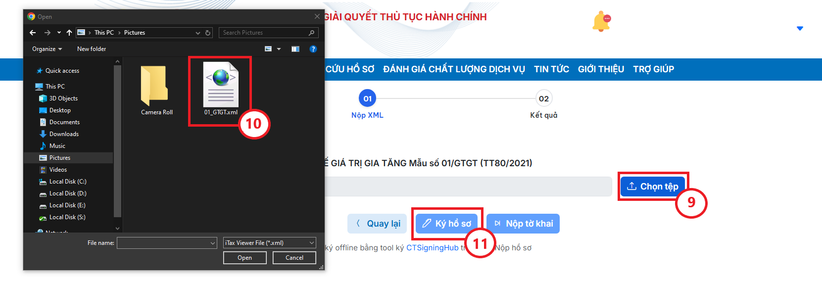 Bước 2.6: Bạn bấm Chọn tệp (9) để chọn tờ khai XML đã làm từ HTKK (10), sau đó bấm Ký hồ sơ (11). Hệ thống hiển thị cửa sổ popup Chọn chữ ký số.