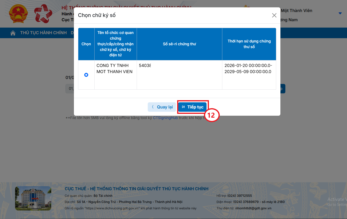 Bước 2.7: Bạn chọn đúng chữ ký số, sau đó bấm Tiếp tục (12) để thực hiện ký tờ khai.