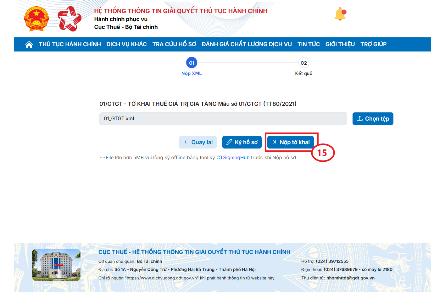 Bước 2.9: Sau khi ký số thành công, Bạn bấm Nộp tờ khai (15) để nộp hồ sơ.