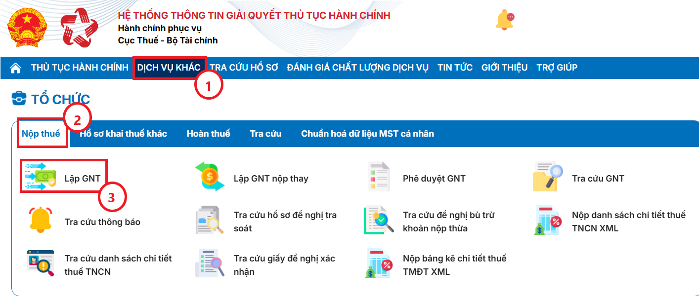 Bước 2: Trên thanh menu, chọn Dịch vụ khác (1), sau đó vào mục Nộp thuế (2) và bấm Lập GNT (3).