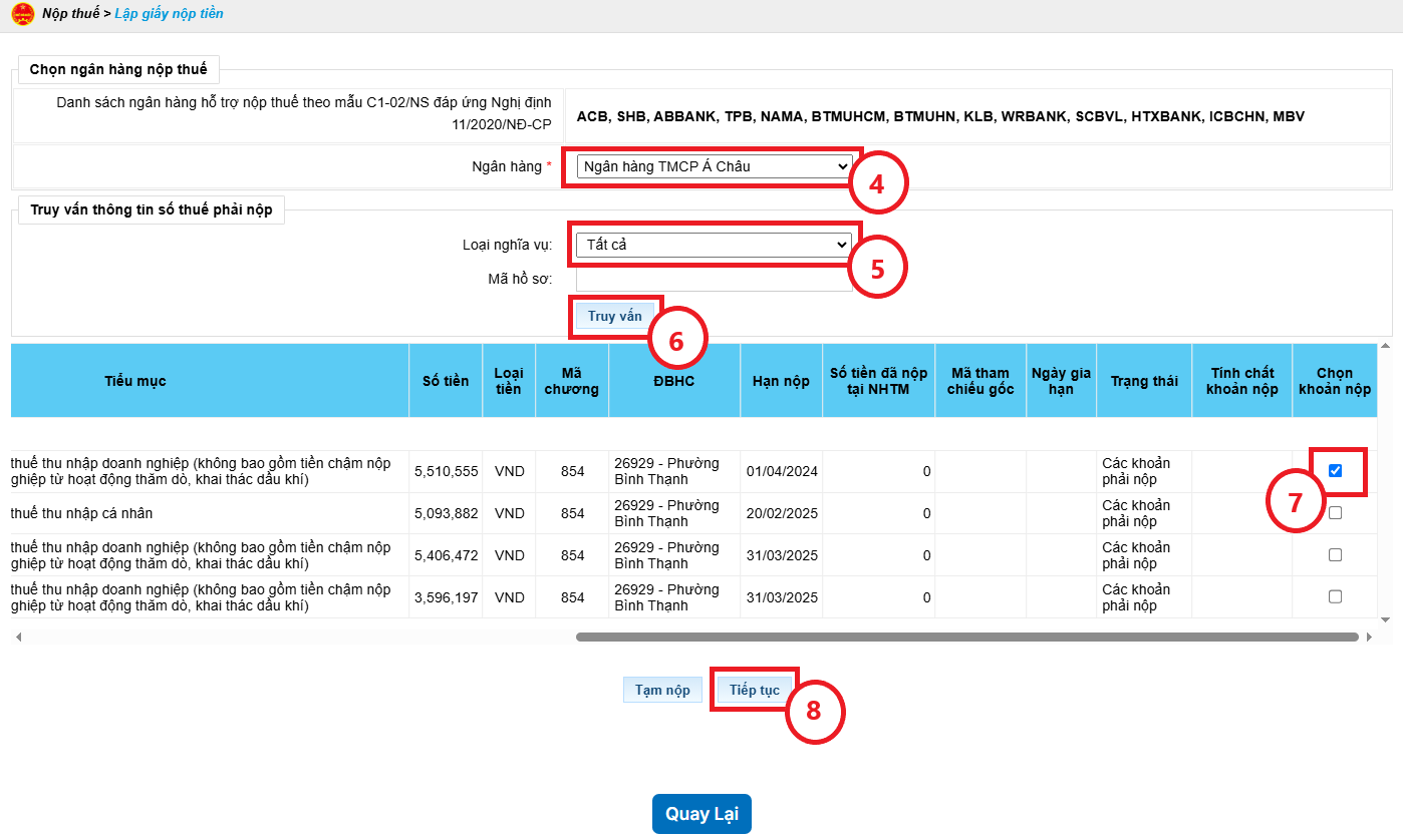 Bước 3: Trên giao diện Lập giấy nộp tiền, Bạn chọn Ngân hàng (4) và Loại nghĩa vụ (5), sau đó bấm Truy vấn (6). Tiếp theo, tick Chọn khoản nộp (7) và bấm Tiếp tục (8).