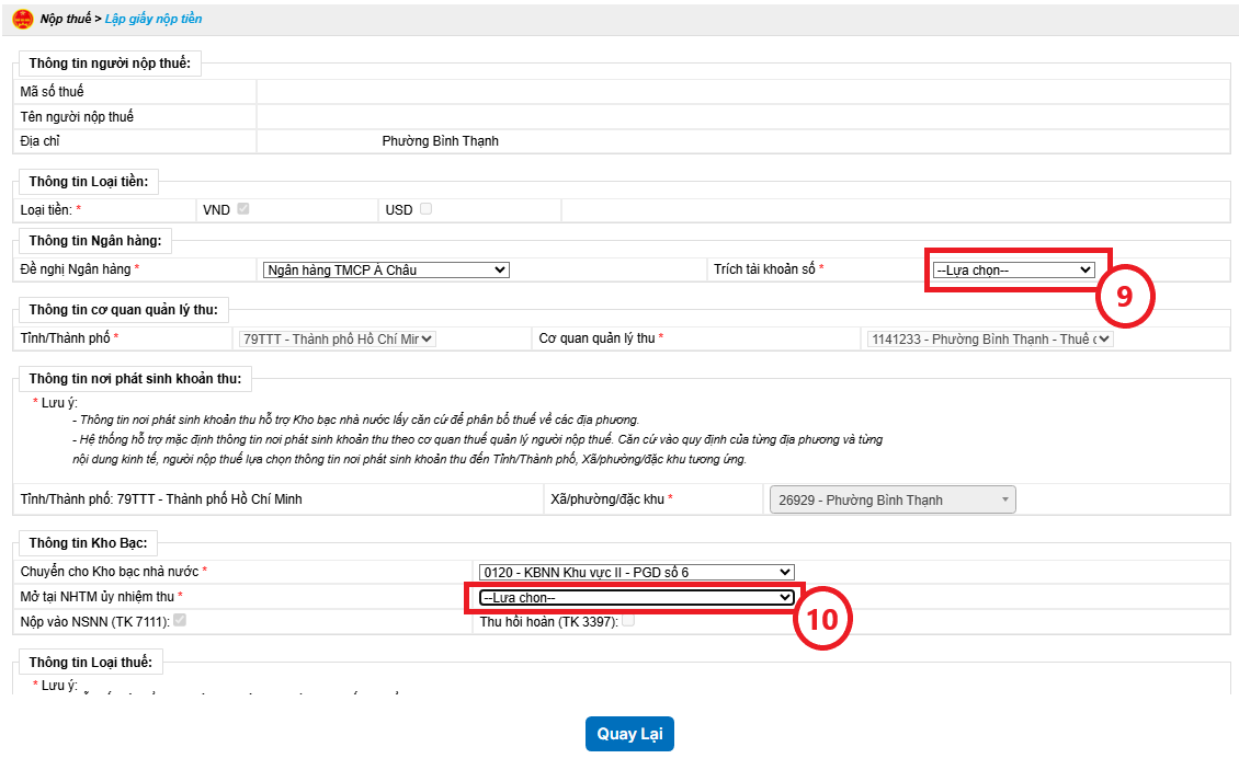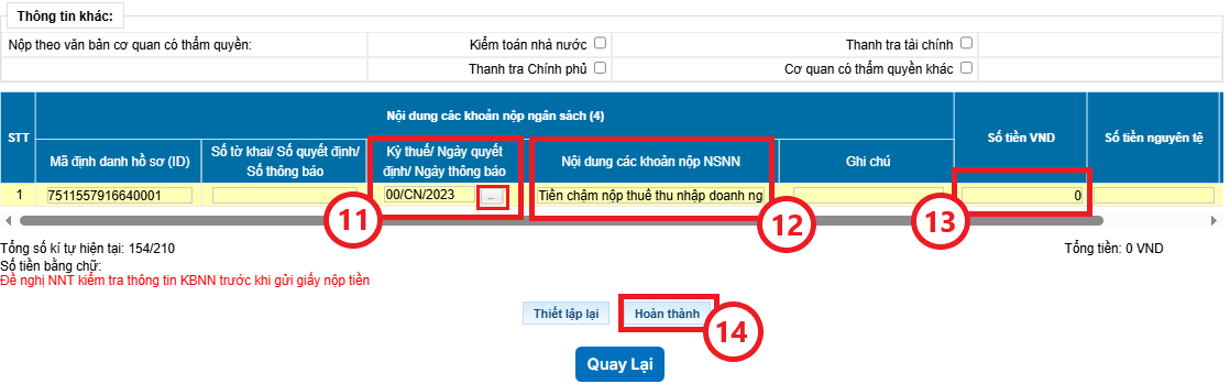 Bước 4: Bạn chọn tiếp Trích tài khoản số (9), chọn Ngân hàng ủy nhiệm thu (10), kiểm tra Kỳ thuế/Ngày quyết định/Ngày thông báo (11), nhập Nội dung các khoản nộp (12), nhập Số tiền (13), sau đó bấm Hoàn thành (14) để gửi giấy nộp tiền.