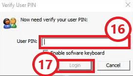 Bước 6: Hệ thống hiển thị cửa sổ nhập User Pin, Bạn nhập Số PIN (16) sau đó bấm Login (17).