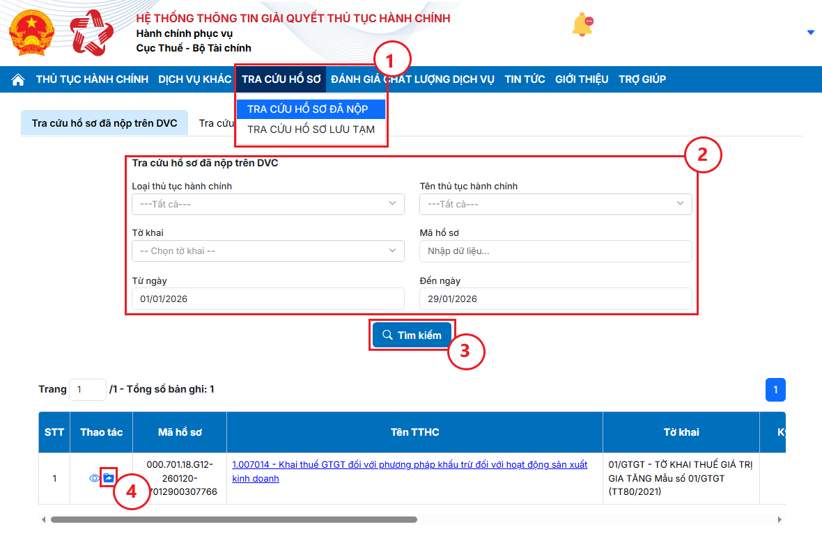 Bước 2: Trên thanh menu, Bạn vào Tra cứu Hồ sơ, chọn Tra cứu Hồ sơ đã nộp trên DVC (1), nhập thông tin tra cứu (2), bấm Tìm kiếm (3), sau đó trên danh sách hồ sơ chọn Nộp hồ sơ bổ sung (4).