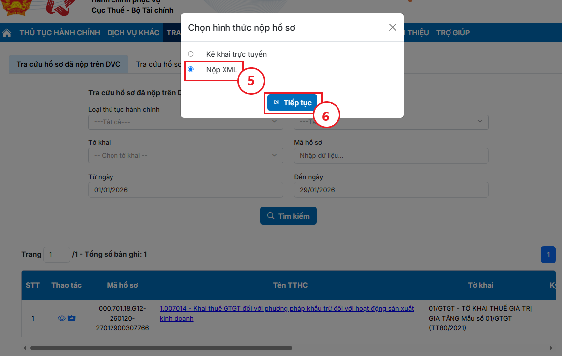 Bước 3: Hệ thống hiện Popup Chọn hình thức nộp hồ sơ bạn chọn hình thức Nộp XML (5), bấm Tiếp tục (6) để chọn tờ khai XML.