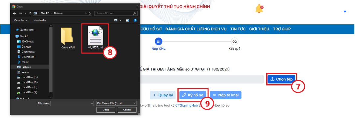 Bước 4: Bạn bấm Chọn tệp (7) để chọn tờ khai XML đã làm từ HTKK (8), sau đó bấm Ký hồ sơ (9). Hệ thống hiển thị cửa sổ popup Chọn chữ ký số.
