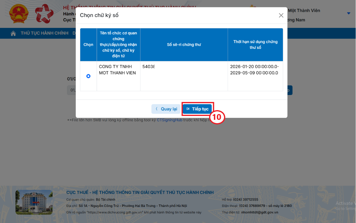 Bước 5: Bạn chọn đúng chữ ký số, sau đó bấm Tiếp tục (10) để thực hiện ký tờ khai.