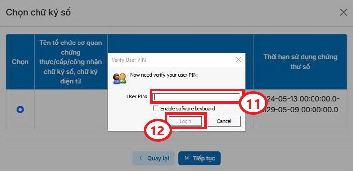 Bước 6: Bạn nhập User PIN (11), sau đó bấm Login (12) để tiếp tục.